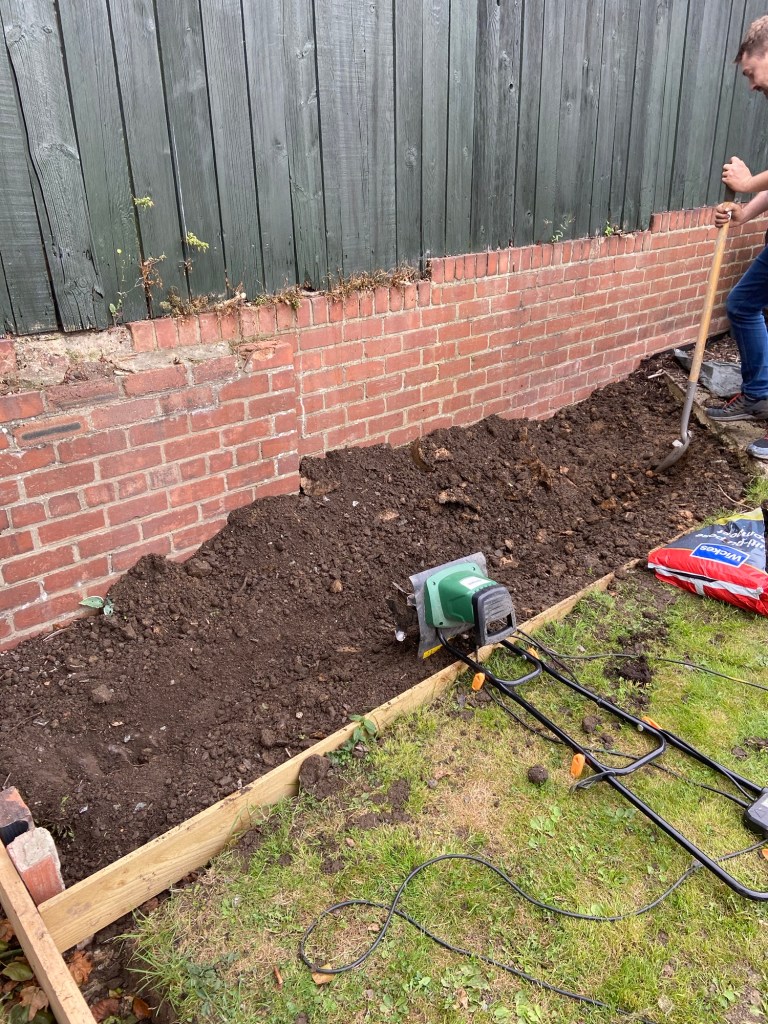 In September, the only thing we started was prepping the soil in the garden ready for hedges to be planted. They arrived in early October, and we spent a few days planting them in the border around the garden.