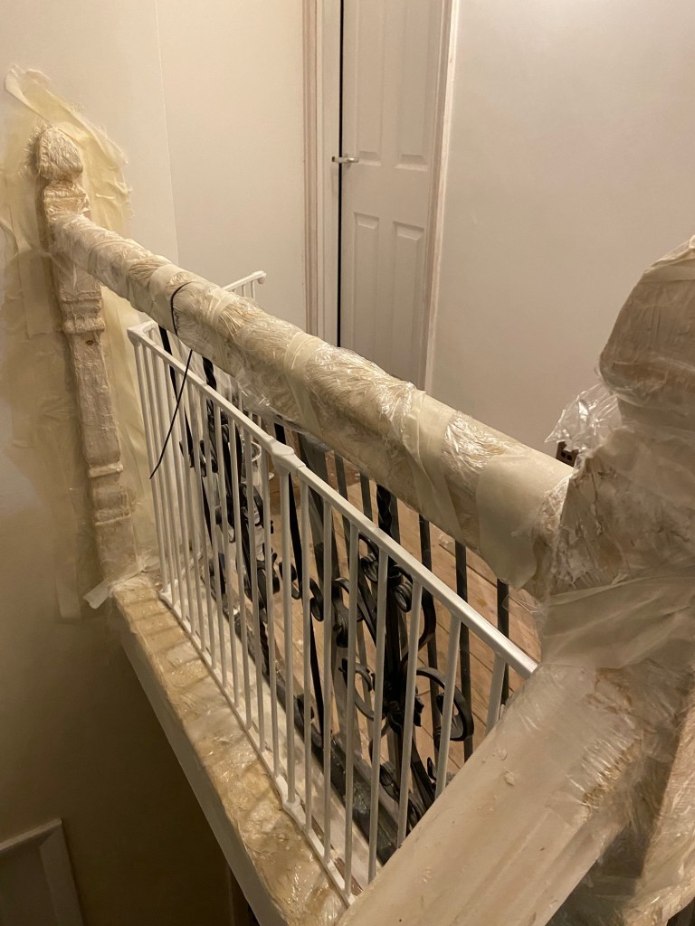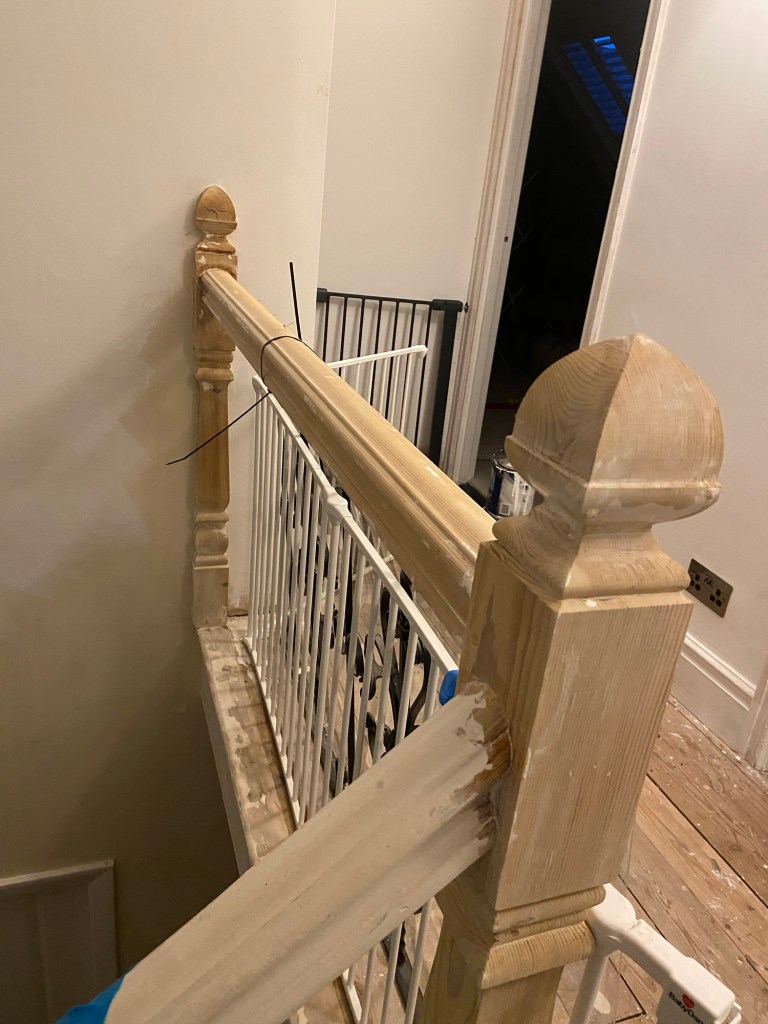 Meanwhile I got to work on applying Klingstrip to the newel posts and handrail. We had tried to use the heatgun on this in the past but it was so fiddly and time consuming we decided to use Klingstrip here instead. It’s messy when cleaning it off but it did a good job in removing years of gloss paint.